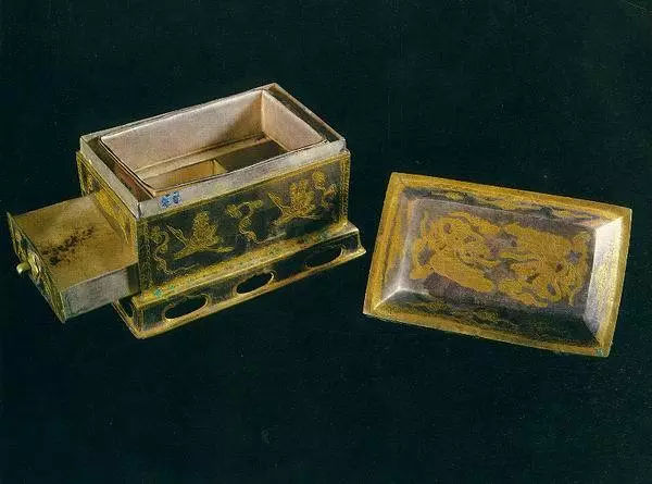 通高9.5厘米,羅身長(zhǎng)13.4厘米,寬8.4厘米。屜長(zhǎng)12.7厘米,寬7.5厘米,高2.0厘米。座長(zhǎng)14.9厘米,寬8.9厘米,高2.0厘米,全重1472克。通體呈長(zhǎng)方形,由蓋、羅、屜、羅架、器座組成,均系鈑金成型,紋飾涂金。蓋頂鏨兩體首尾相對(duì)的飛天,并襯以流云。蓋剎四周各飾一和合云。羅架兩側(cè)飾執(zhí)幡駕鶴仙人,另兩側(cè)為相對(duì)飛翔的仙鶴,四周飾蓮瓣紋。羅和屜均為匣狀,中夾羅網(wǎng),屜面飾流云紋,有拉手。羅架下有臺(tái)形座器,設(shè)鏤空壺門(mén)。
