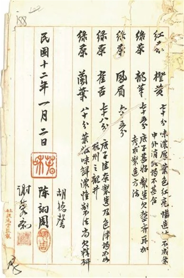 1922年11月,朱文精將實(shí)習(xí)所焙制的5種茶樣交實(shí)業(yè)司,轉(zhuǎn)送上??偵虝诱垖<以u定。擔(dān)任上海總商會展覽會茶葉審查員的胡德馨、陳翊周、謝蓉齋3位茶業(yè)專家在詳細(xì)查驗(yàn)品評茶樣后,聯(lián)合出具了報(bào)告書。報(bào)告書記載,5份茶樣,合紅茶1份,綠茶4份,分別是橙黃、龍華、鳳眉、雀舌、蘭葉。其中蘭葉“葉嫩味鮮濃”得分最高,獲得80分。總體來看,專家們認(rèn)為茶業(yè)實(shí)習(xí)所送評的茶葉,無論紅茶還是綠茶,茶葉的底子都好,但制法上尚欠精研,還需提高。