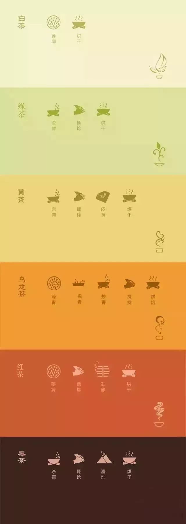 上圖是六大茶類的制作工藝,而事實上,六大茶類各有一道關(guān)鍵工序,這道關(guān)鍵工序是正是六大茶類分類的標(biāo)準(zhǔn)來源。