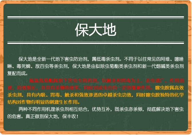2、土壤處理:撒施顆粒劑,每畝使用保大地2-3袋,于傍晚時(shí)分均勻施撒于地面,可確保地下害蟲(chóng)晚上出土?xí)r******殲殺。