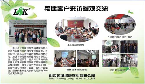 為加大客戶與公司之間的信任度,增加銷量,2014年9月23日,閔北區(qū)業(yè)務(wù)經(jīng)理陳鋒帶領(lǐng)福建客戶來(lái)綠康公司參觀學(xué)習(xí),由技術(shù)總監(jiān)薛工帶領(lǐng)大家參觀生產(chǎn)工廠。首先參觀了我公司用于統(tǒng)防統(tǒng)治的美國(guó)三角翼,為了貼合******統(tǒng)防統(tǒng)治的植保理念,為了提高防治病蟲害效果,綠康公司于2012年成立了統(tǒng)防統(tǒng)治合作社,并購(gòu)置美國(guó)原裝進(jìn)口塔瑞斯MA-34R528XB農(nóng)藥噴灑飛機(jī)五架??蛻粼趨⒂^飛機(jī)后對(duì)公司先進(jìn)的植保理念表示贊賞。