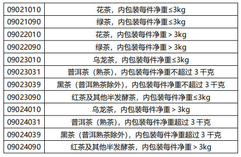 2020年12月,國務院關(guān)稅稅則委員會對茶葉類進出口稅號進行了調(diào)整,新增黑茶出口稅號類目,調(diào)整后茶葉進出口商品編碼及商品名稱信息如下: