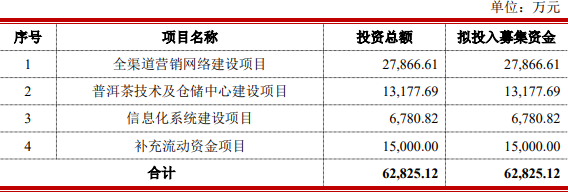 瀾滄古茶原擬在深交所主板公開發(fā)行不超過2000萬股人民幣普通股(A股),占公司本次公開發(fā)行后總股本的比例不低于25%。瀾滄古茶原擬募集資金6.28億元,分別用于“全渠道營銷網(wǎng)絡(luò)建設(shè)項目”、“普洱茶技術(shù)及倉儲中心建設(shè)項目”、“信息化系統(tǒng)建設(shè)項目”、“補充流動資金項目”。