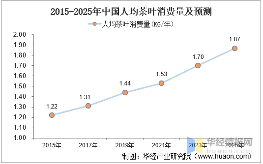 茶始終是中國(guó)消費(fèi)者現(xiàn)制飲料消費(fèi)的最大品類,茶葉消費(fèi)市場(chǎng)規(guī)模依然遠(yuǎn)高于近年來(lái)在中國(guó)快速增長(zhǎng)的咖啡市場(chǎng):2019年中國(guó)茶葉銷售額達(dá)2740億元,遠(yuǎn)高于咖啡678億元的市場(chǎng)規(guī)模。從人均茶葉消費(fèi)量來(lái)看,2015-2019年人均消費(fèi)量持續(xù)增長(zhǎng),由1.22千克/年增長(zhǎng)至1.44千克/年,預(yù)計(jì)未來(lái)將維持增長(zhǎng)態(tài)勢(shì),2025年可達(dá)到1.87千克/年。