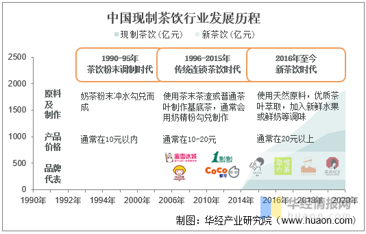 中國(guó)現(xiàn)制茶飲行業(yè)走過(guò)來(lái)三個(gè)階段:1990-1995的茶飲粉末調(diào)制時(shí)代;1996-2015年的傳統(tǒng)連鎖茶飲時(shí)代,以蜜雪冰城、一點(diǎn)點(diǎn)、COCO等品牌為代表;2016年至今的新茶飲時(shí)代,以奈雪的茶、喜茶、茶顏悅色等品牌為代表。
