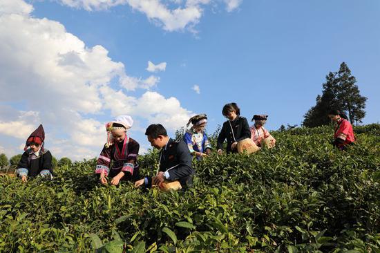 圖為普安縣稅務(wù)局干部積極服務(wù) “貴州綠茶”第一采活動,向茶農(nóng)宣傳惠農(nóng)稅收優(yōu)惠政策,并同布依族群眾采摘新年的第一茬綠茶。謝昌明 攝