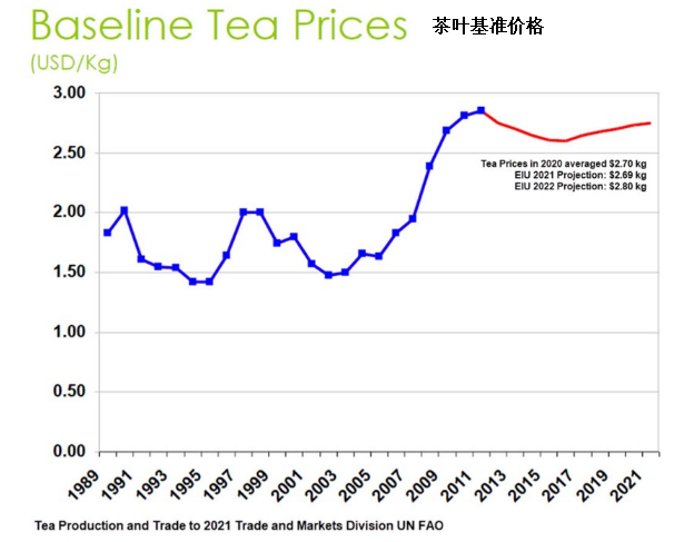 經(jīng)濟學(xué)人智庫(EIU)估計茶葉價格將上漲至接近長期平均水平,“我們預(yù)計,因為供不應(yīng)求,加上一些市場(特別是歐洲和北美)的茶葉需求逐漸復(fù)蘇,2021年剩余時間茶葉價格會穩(wěn)中有升。我們估計2021年全年平均價格為2.69美元/公斤,比 2020 年下降 0.5%。2022年茶葉均價將上漲 8.7%,至2.92 美元/公斤。”